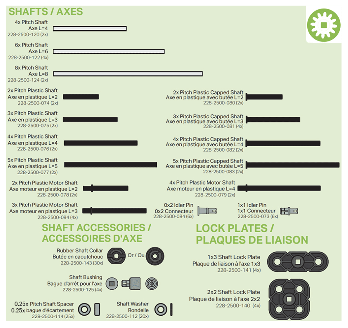 Những trục nhẹ này dùng cho các ứng dụng mô-men xoắn thấp. Chúng có sẵn với kích thước pitch 2x, 3x, 4x, và 5x trong Super Kit, Foundation Add-on Pack, hoặc Plastic Shaft Base Pack.