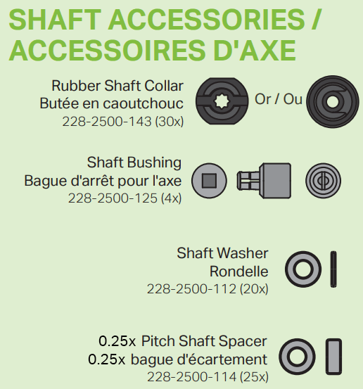 Đặt Shaft Washer hoặc 0.25x Pitch Spacer trên trục và giữa một thành phần cấu trúc đỡ và bộ phận/assembly, rồi sau đó trượt một Rubber Shaft Collar lên trục ở phía còn lại của bộ phận để giữ nó không trượt theo cả hai hướng.
