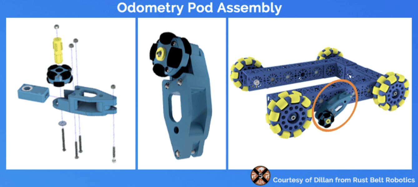 Kiểu chủ động (Odometry Pods/Dead Wheels): Thay vì dựa vào động cơ, ta có thể lắp thêm 1 bộ phận bánh xe phụ chuyên đếm số vào robot (thường gọi là odometry pod), trực tiếp đo vòng xoay của các bánh xe để đưa ra kết quả thực tế hơn. Thông thường, mỗi robot sẽ có từ 2 đến 3 bánh lăn khảo sát 2 chiều ngang và dọc của chuyển động. Mặc dù các pod này có độ chính xác cao, chúng lại khó thiết kế hơn do sự phức tạp trong thiết kế và giá thành đắt đỏ hơn so với kiểu thụ động. Các thiết kế cũng cần phải cân nhắc không gian và đảm bảo sao cho các bánh xe luôn chạm đất.