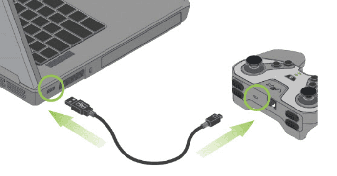 Sơ đồ Controller đang được sạc từ laptop bằng cáp USB.