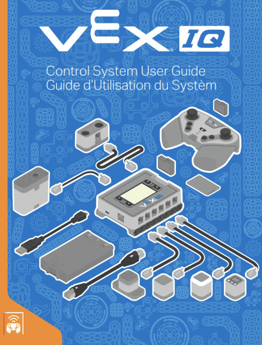 Trang bìa trước của VEX IQ Control System User Guide, với sơ đồ nhiều linh kiện điện tử VEX IQ được kết nối với một IQ Brain.