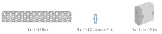 Danh sách linh kiện cần cho một bước lắp ráp mẫu, bao gồm: 1 Beam 2×12, 6 Connector Pins 1×1, và 1 Smart Motor.