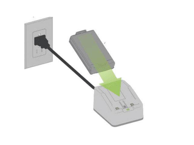 Sơ đồ pin Robot Brain được đặt vào bộ sạc, bộ sạc được cắm vào ổ điện.