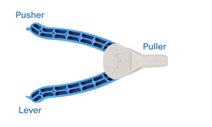 Sơ đồ Pin Tool của VEX: đầu nhọn ở giữa được gọi là Puller (dụng cụ kéo), một đầu tay cầm được gọi là Pusher (dụng cụ đẩy), và tay cầm còn lại là Lever (đòn bẩy).