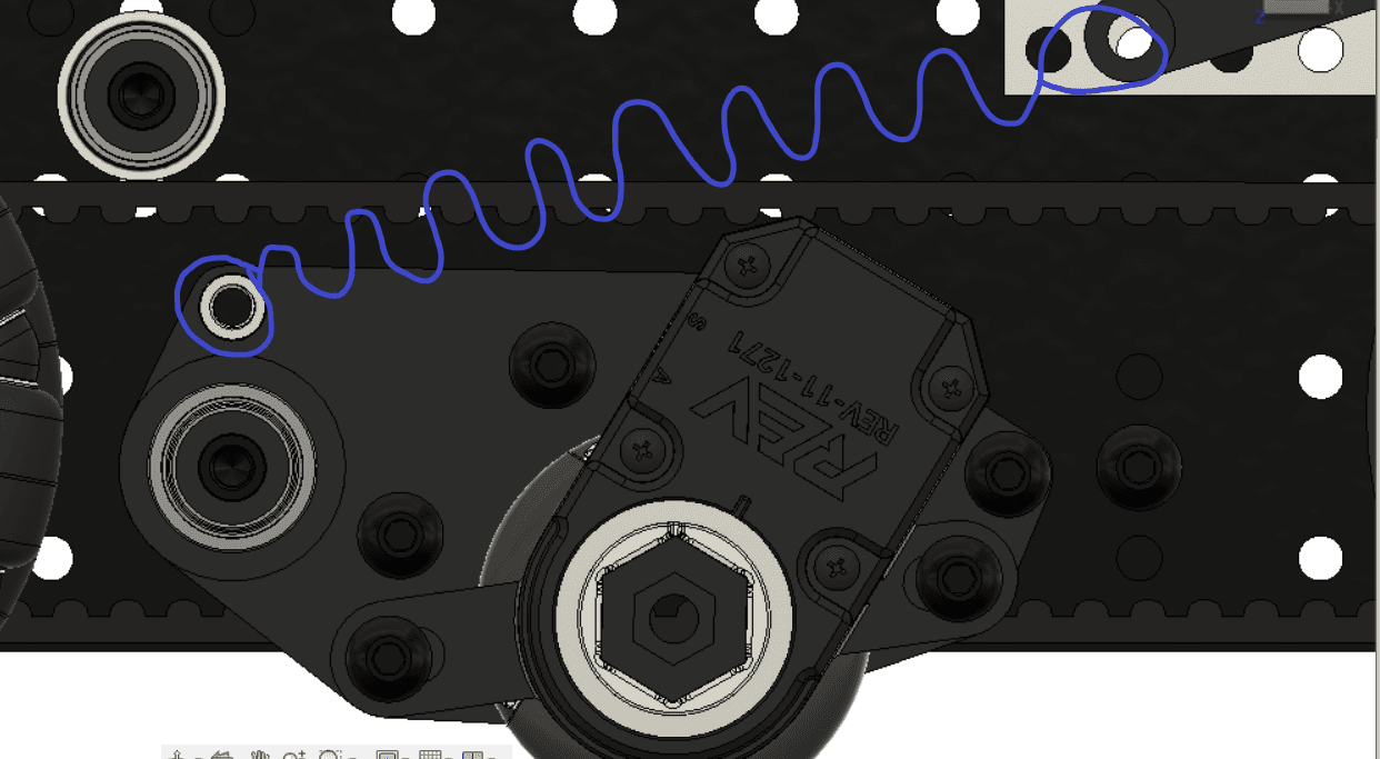 Một lò xo kéo có đầu vòng (extension spring with loop ends) được móc vào vít phía sau đang cố định bộ mã hóa REV (REV Encoder) và kéo về một điểm nằm phía sau mô-đun.