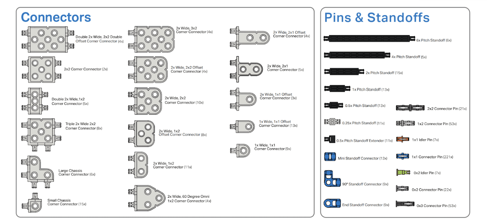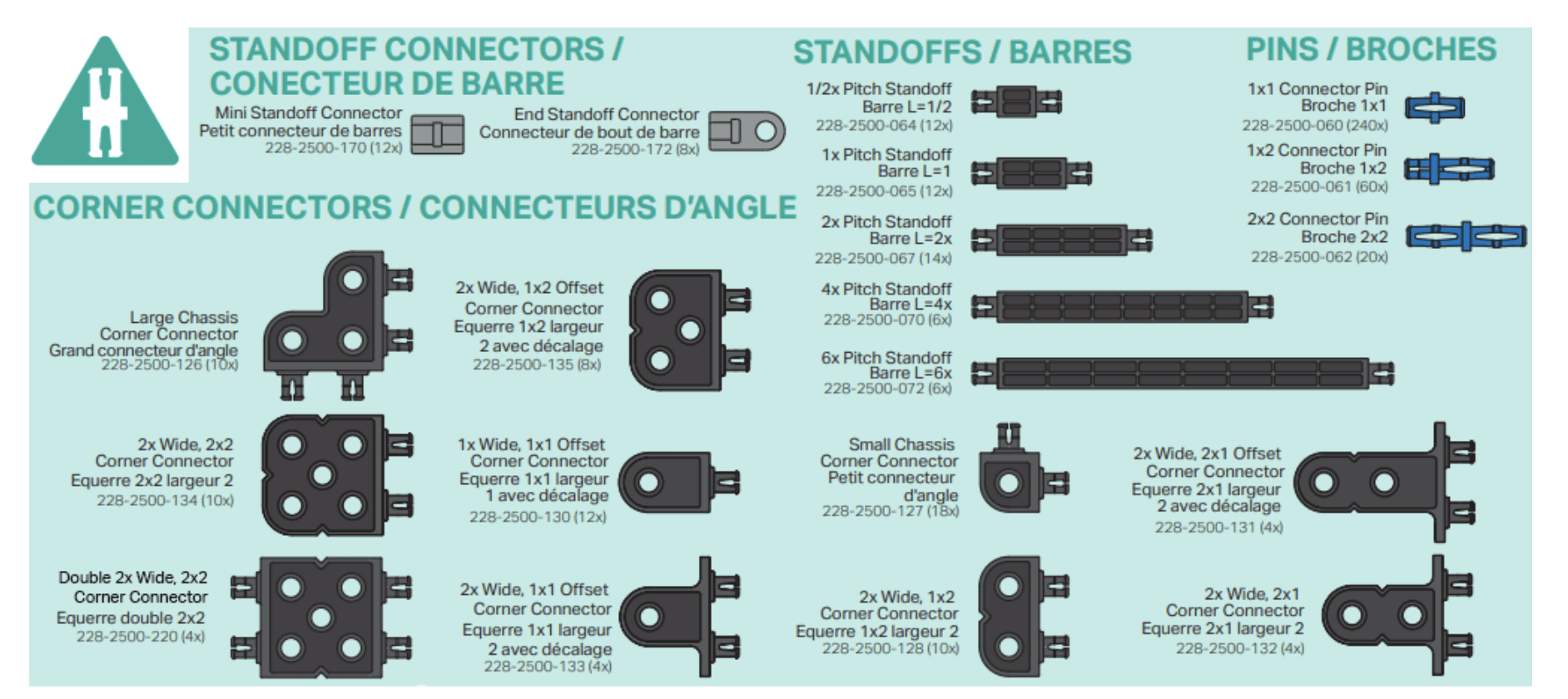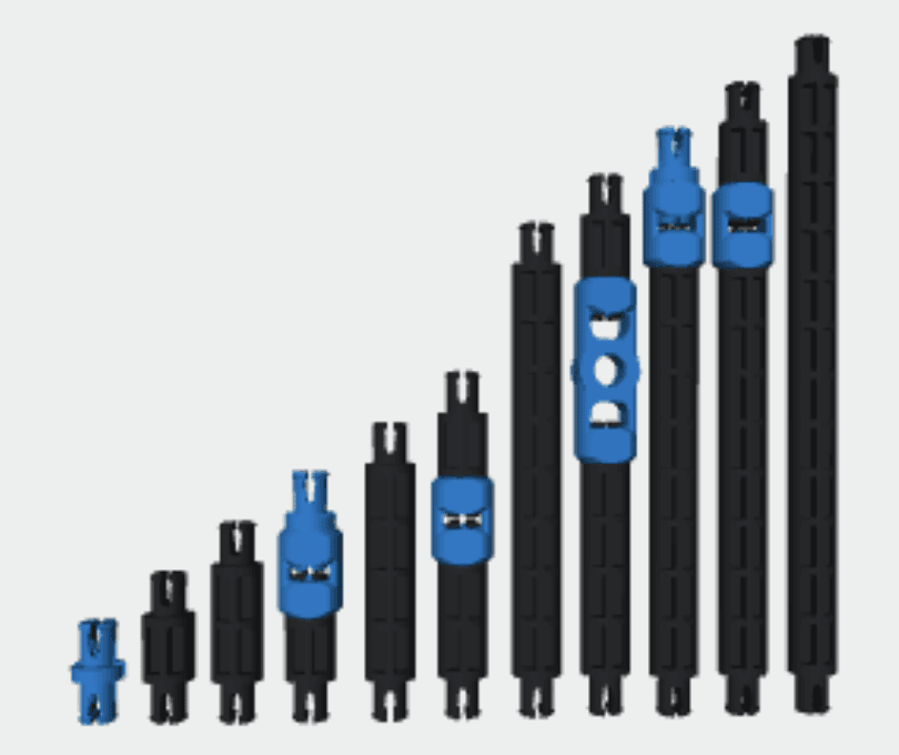 Các gá và trục cố định khoảng cách có trong bộ thế hệ 1 và thế hệ 2 hoạt động theo cùng một nguyên lý, tuy nhiên có thể khác nhau về màu sắc. Bộ thế hệ 2 cung cấp các loại gá và trục cố định khoảng cách bổ sung.