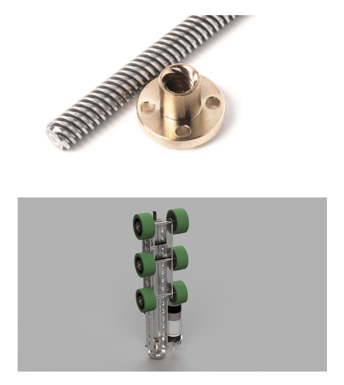 → Hình ảnh một trục vít me với vật thể trượt theo nó.A render of 11115's Rover Ruckus hang mechanism, using lead screws