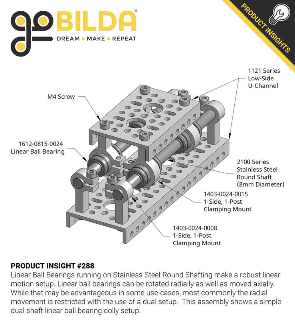 → goBILDA cung cấp round linear bearings với kẹp kim loại (metal clamps) và trục (shafts).