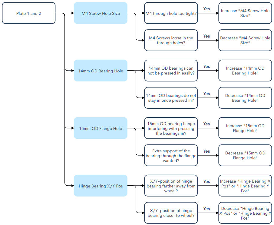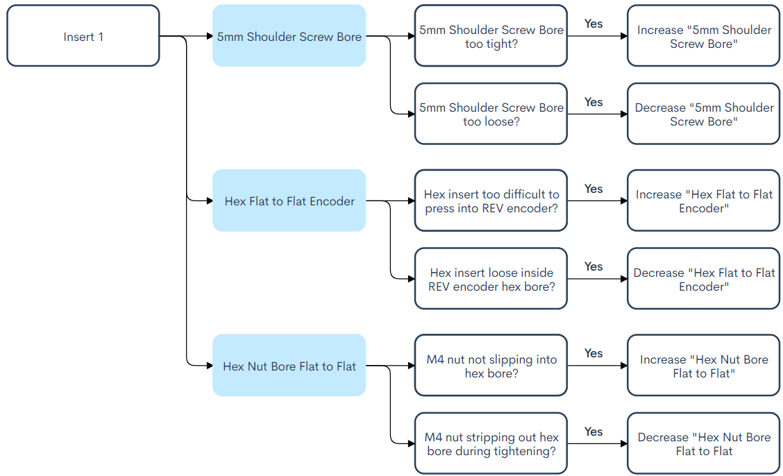 Trong OpenOdometry CAD, có sẵn các biến cấu hình tích hợp để giúp điều chỉnh kích thước của lỗ (holes)lục giác (hexagons) sao cho phù hợp với độ dung sai (tolerance) của máy in 3D cụ thể mà bạn sử dụng.