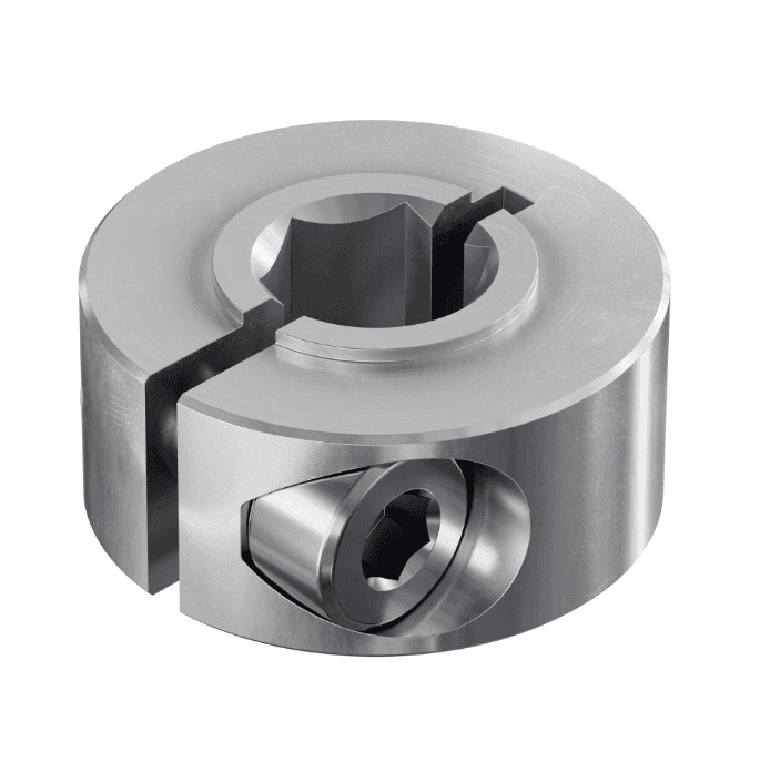 Một set screw collar thường có vít grub (vít chốt nhỏ không đầu) để siết chặt vào trục.