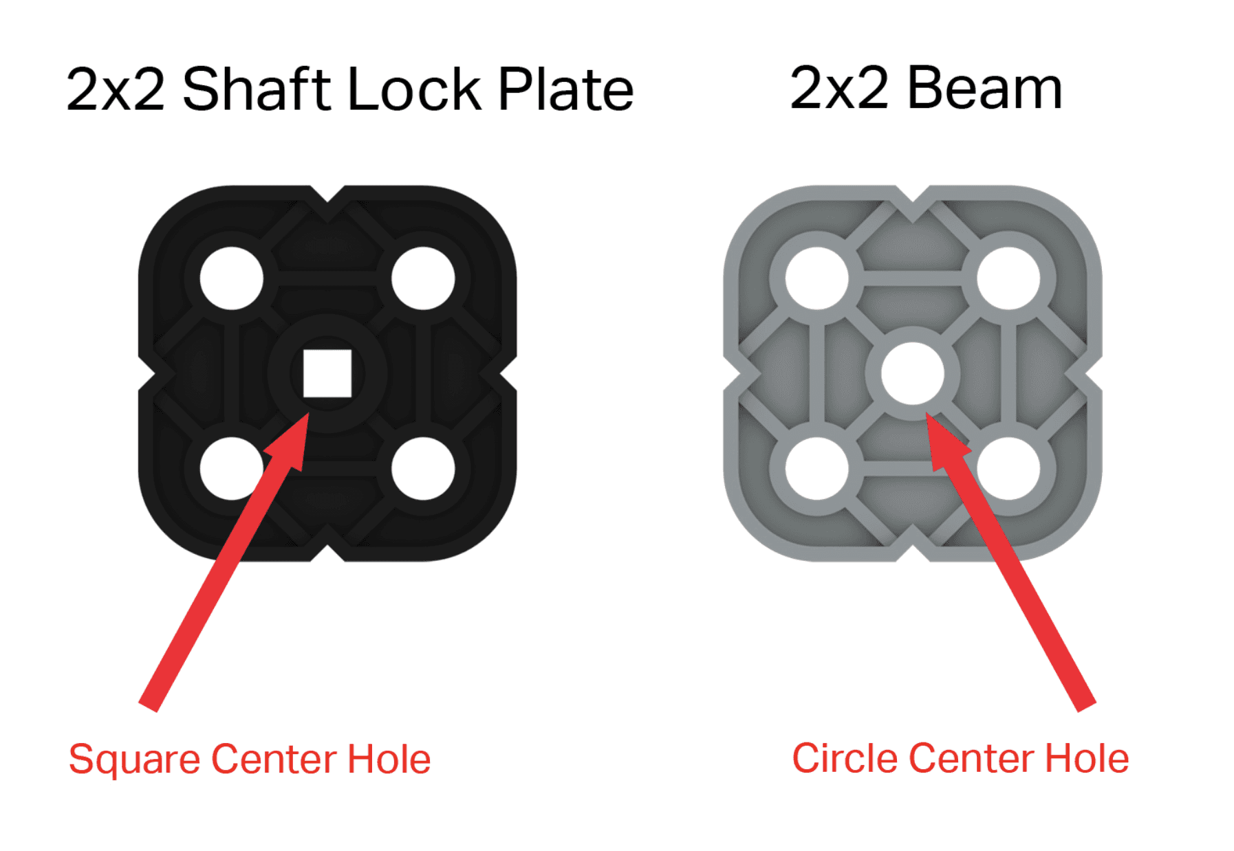 Phân biệt tấm khóa trục 2x2 và thanh 2x2 thanh: tấm khóa trục 2x2 tấm thường bị nhầm lẫn với thanh 2x2. Trong hầu hết các trường hợp, điều này không gây vấn đề. Tuy nhiên, nếu lỗ lắp trung tâm của thanh cần được sử dụng cho khớp nối, standoff, trục thì bắt buộc phải chọn thanh 2x2, bởi vì vị trí này trên tấm khóa trục là một lỗ vuông.